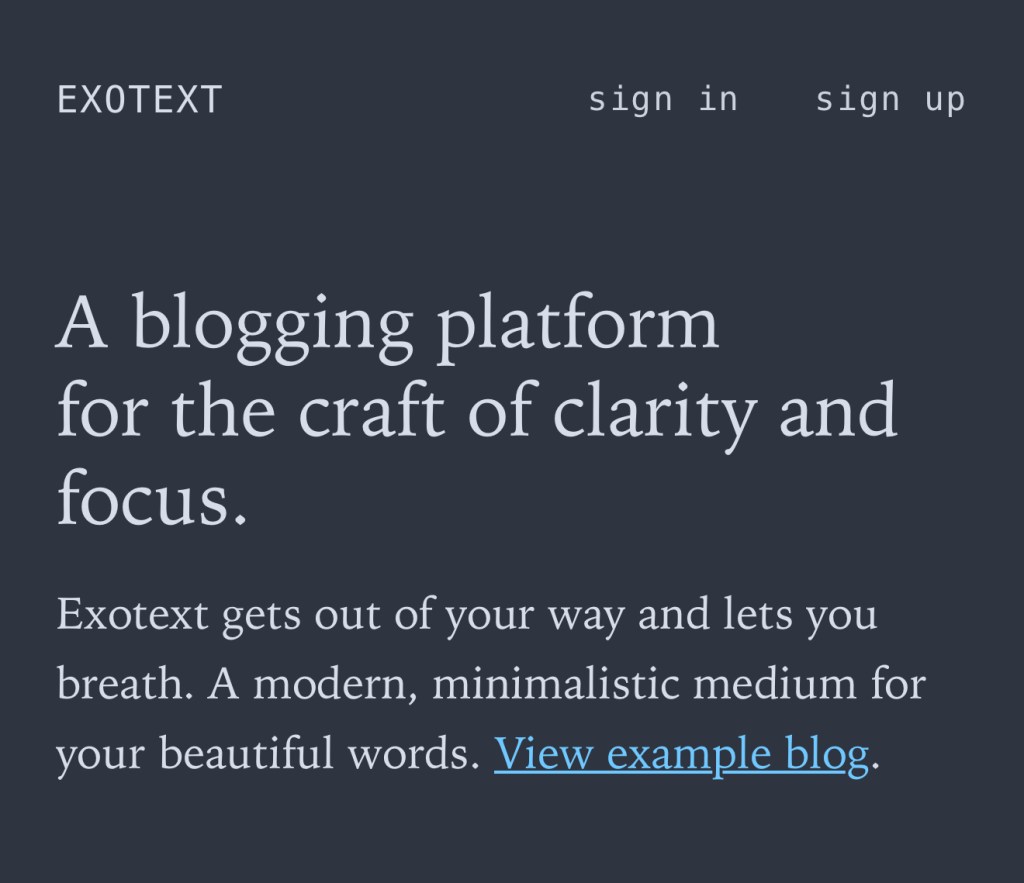 Exotext gets out of your way and lets you breath. A modern, minimalistic medium for your beautiful words.