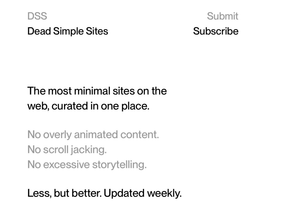 The most minimal sites on the web, curated in one place. No overly animated content. No scroll jacking. No excessive storytelling. Less, but better. Updated weekly.