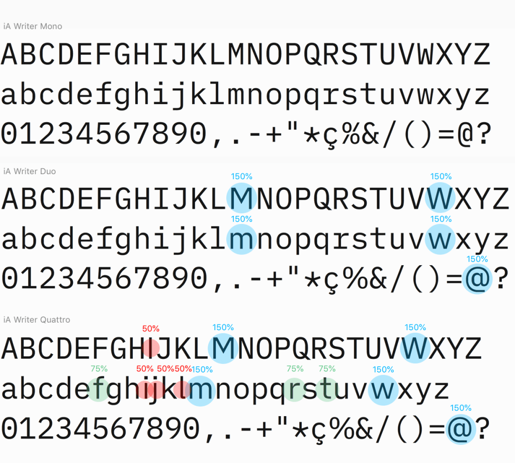 For in depth explanation of iA Writer Mono, Duo, and Quattro please read our blog entry on Duospace and on iA Writer Mono, Duo, and Quattro