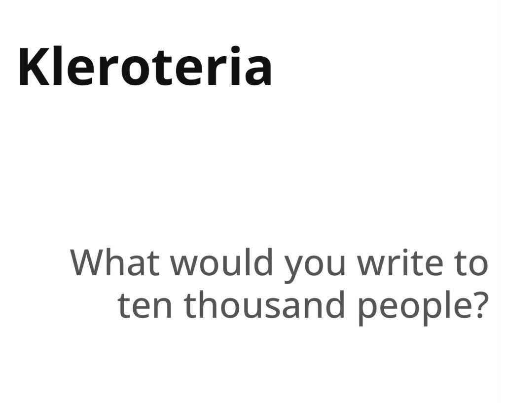 Kleroteria is an email lottery. Periodically, a subscriber – who may remain anonymous – is randomly chosen to write to all the other subscribers.