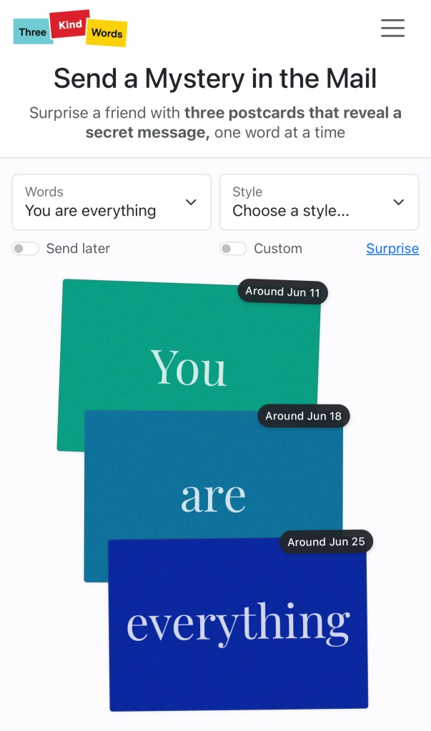 Send a Mystery in the Mail: Surprise a friend with three postcards that reveal a secret message, one word at a time.