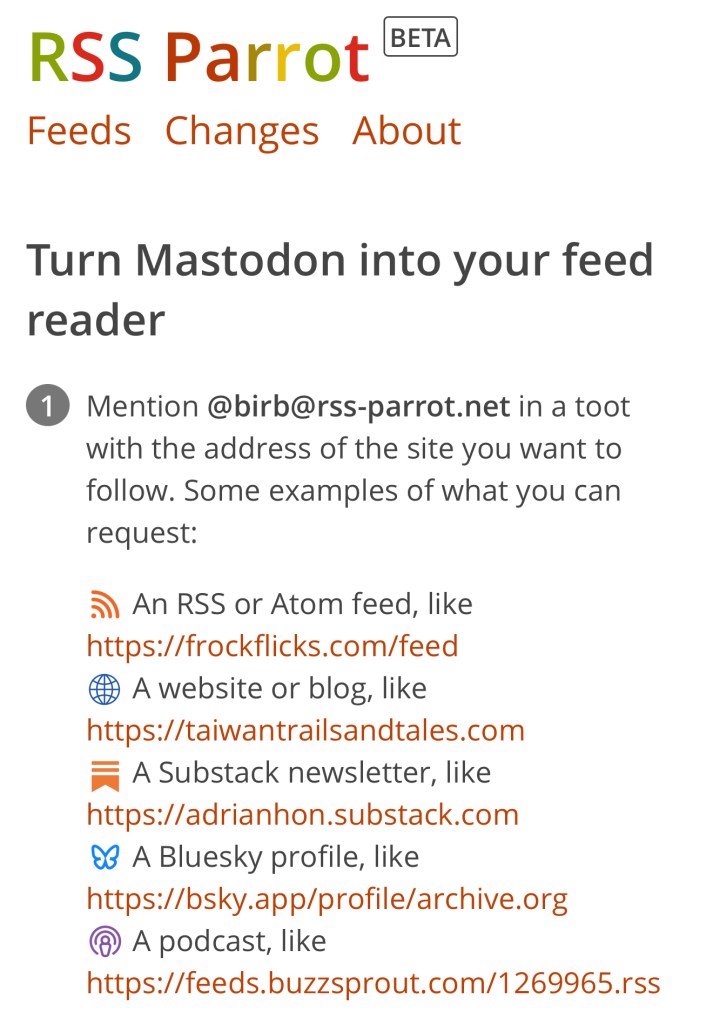 Home of RSS Parrot, a free Fediverse service that lets you turn Mastodon into an RSS or Atom feed reader.
