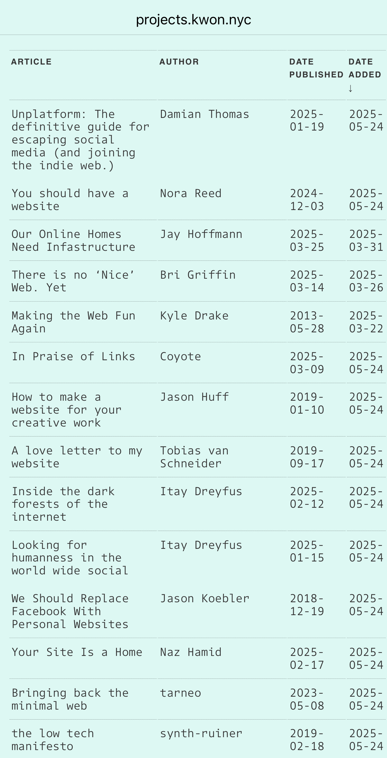 So for now, here’s a collection of articles that to some degree answer the question “Why have a personal website?” with “Because it’s fun, and the internet used to be fun.” — Rachel J. Kwon