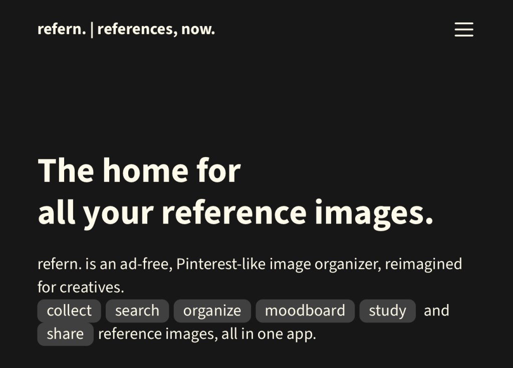 refern.app is an ad-free, Pinterest-like image organizer, reimagined for creatives — save, find, organize, moodboard, study & share curated reference images all in one app.