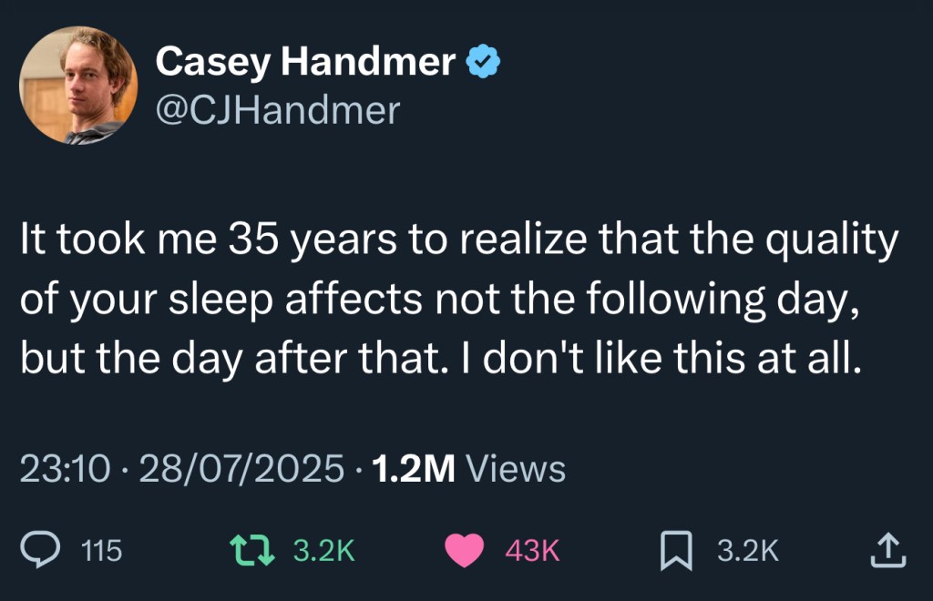 “It took me 35 years to realize that the quality of your sleep affects not the following day, but the day after that. I don’t like this at all.” — Casey Handmer on X: @CJHandmer